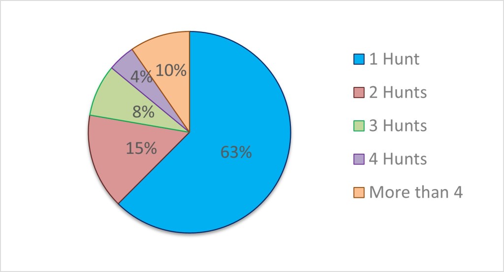 In Part 1 I explained that there is a difference between Hunting Videos (HVs) and Hunts, with some HVs consisting of more than one Hunt. Of the 229 HVs curated a maximum of 18 Hunts were shown in two of the videos. The majority of the videos showcased only one Hunt at 63%, with two, three and four Hunts at 15%, 8% and 4%, respectively (see Figure 1). Only 1 in 10 of the HV’s curated showcased more than 4 Hunts.