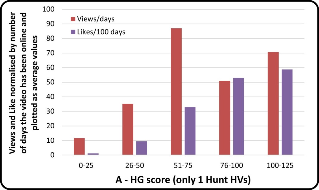 The HuntGaugeTM (HG) score is calculated using a scoring system I developed for use on this blog, you can read more about it here. In conceiving of the HG system, I never made use of any of video analytics or metrics-data I captured. So, I thought it would be interesting to see how the HG score stacks up against video View and Like data. Figure 3 shows HG score in 25-point increments plotted against Views and Likes, with Figure 3A showing only HVs with one Hunt and 3B showing data from all HVs (outlier video data omitted). There is a strong general trend where increasing HG score resulted in a commensurate increase in Views and Likes, across both datasets analysed.