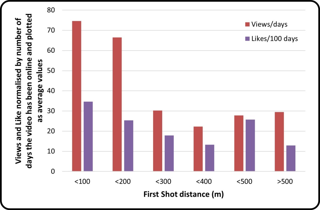 Figure 5 shows the approximate distance of the First shot in the Hunt. Second shots or follow-up shots are not taken into consideration here. Approximating distances on video is by no means an exact science, and I must stress that the distances are approximate (sometimes the distance of the First shot is mentioned in the HV, but most of the time it must be estimated), and that’s why distance increments of 100 m are plotted. The most Views and Likes are observed at a distance of 100 m or closer, followed closely by shots shorter than 200 m. There is a very significant decrease in both Views (more than 50%) and Likes (almost 30%) when increasing the distance to 200-400 m. There is a slight increase in these HV metrics when the distance is greater than 400 m. This slight increase can be attributed to the recent trend and increasing popularity in #LongRange hunting, where specialized rifles and equipment are used to achieve ethical shots on Animals at great distances.