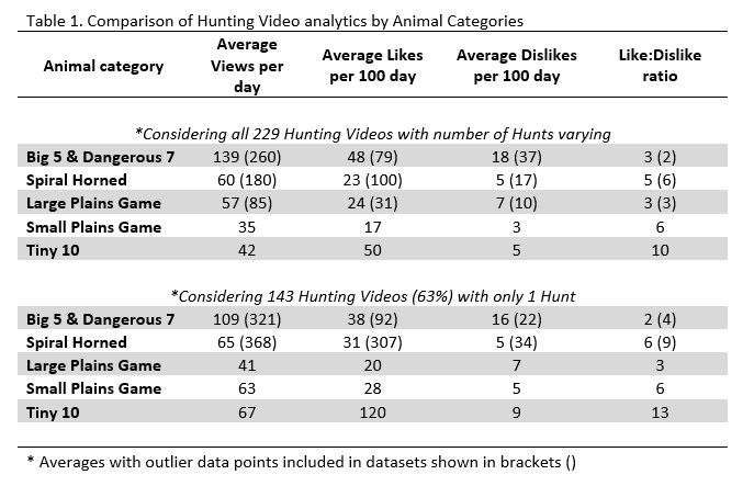 These Animal analysis results can be used to further interrogate the previous result where the number of Hunts at which maxima Views and Likes was observed to be at 2-3 Hunts (see Figure 2). If we analyse the Animal categories in 2-3 Hunt-HVs within the dataset we get a sample of 123 Hunts. Animal categories in this sample of videos were represented at 24%, 22%, 20%, 24% and 11%, for Big 5 & Dangerous 7, Spiral Horned, Large Plains Game, Small Plains Game and Tiny 10, respectively.