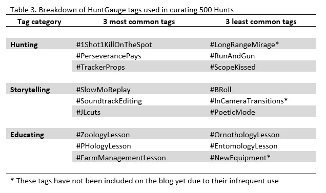 Two of the three HVs had no Hunts that qualified for HG score categories Bronze-Platinum (all below 66 points), and one video had only 5 HG Bronze qualifying Hunts out of the 14 Hunts that made up the total video. This result supports the need for something like a HuntGauge scoring system (see Figure 3), as assessing tags alone, where these three HVs all had the most tags at >25, won’t provide a complete picture of what a quality or “view-worthy” Hunting Video looks like.